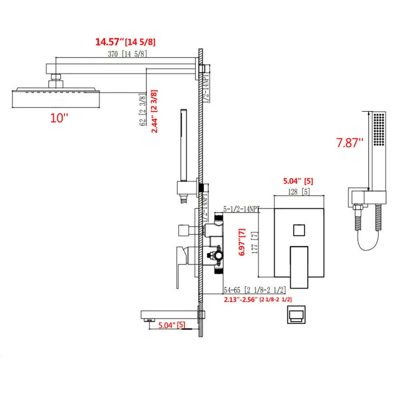 Bathtub Shower Faucet Set Includes: Shower arm, rainfall shower, rough-in valve, and trim kit, handheld shower wand, bracket and hose, tub spout