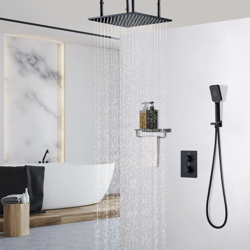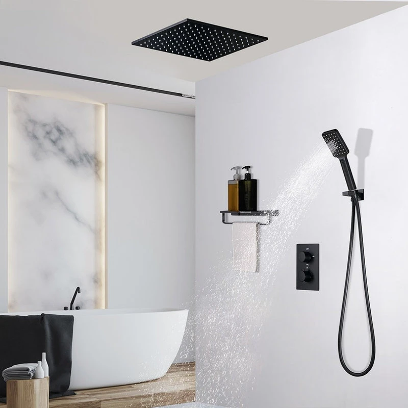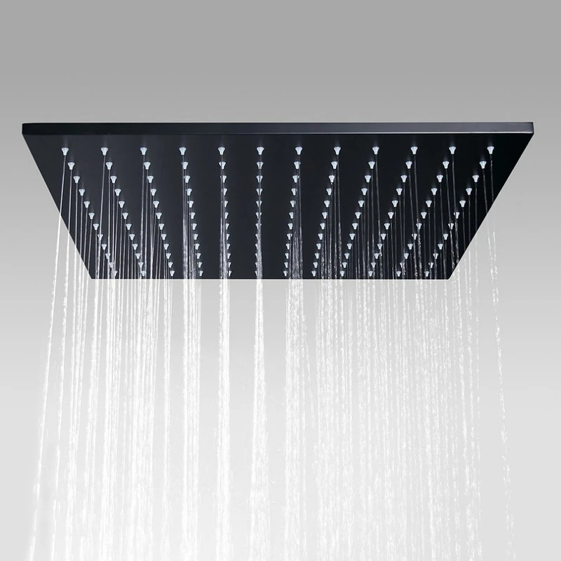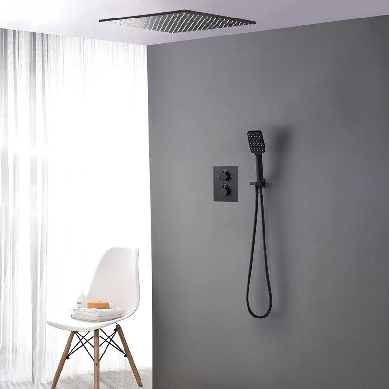Ceiling Mount Square Black Rain Shower System With Body Spray Jets In Wall, 16 I