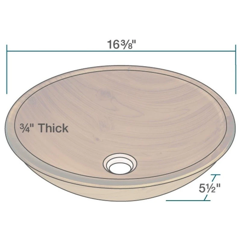 This 3/4″ thick, tempered-glass vessel is circular with warm brown tones and a wood-grain pattern creating the illusion of a wooden basin. Its non-porous surface is extremely attractive and sanitary – naturally resistant to stains, odors, discoloration, and heat damage. With an overall measurement of 16 3/8″ x 16 3/8″ x 5 1/2″, it will require a minimum-width cabinet of 18″. This listing does not include any accessories.