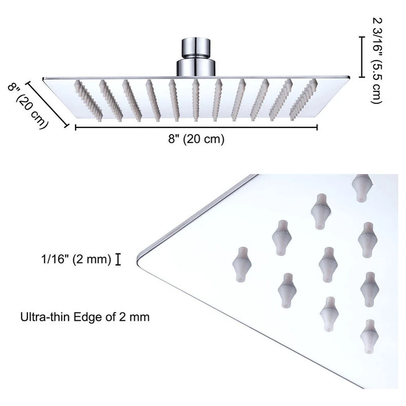 - 8″ ultra-thin designed rainfall shower head with crisp lines, well fits your modern style bathroom