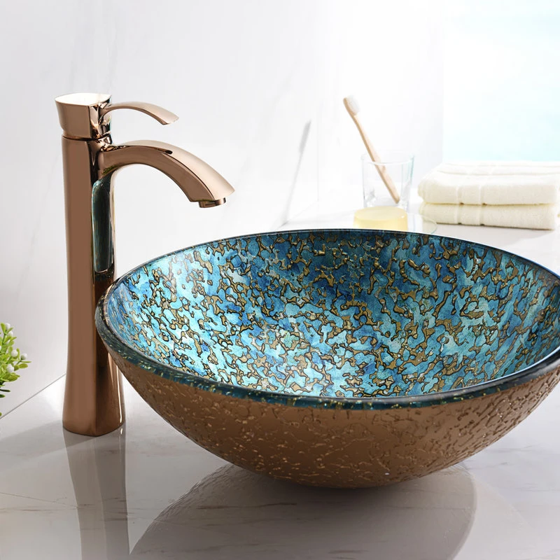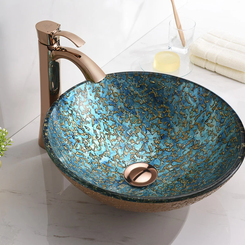 The ANZZI Chrona Series sink is a traditionally crafted round vessel sink adorned in a Gold/Cyan Mix finish. Each ANZZI vessel sink if formed using RHINO ALLOY certified high tempered Deco-Glass material. The result is an elegantly shaped and captivating vessel centerpiece for any bathroom counter.