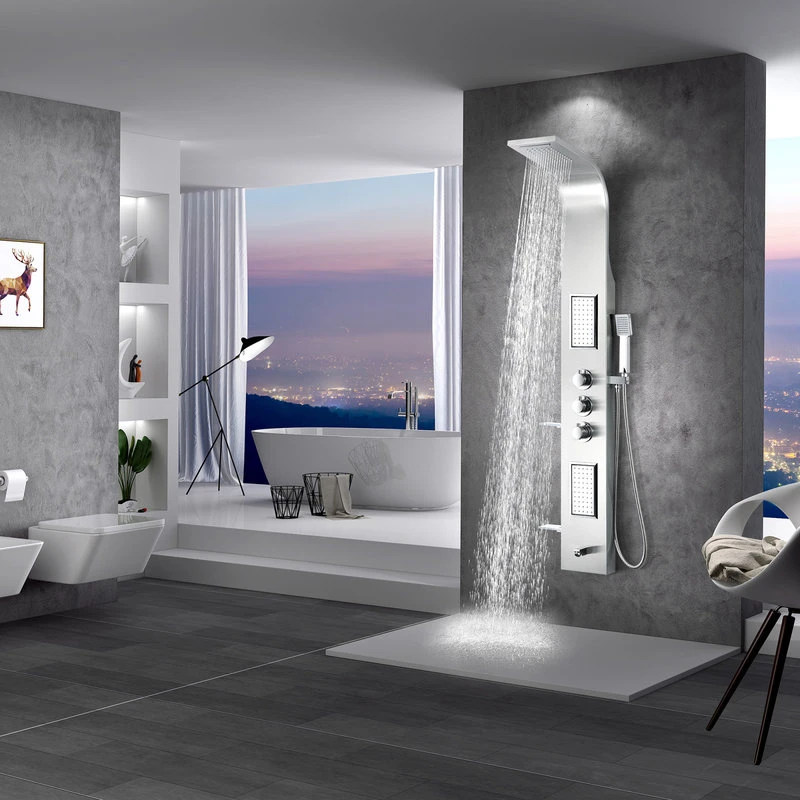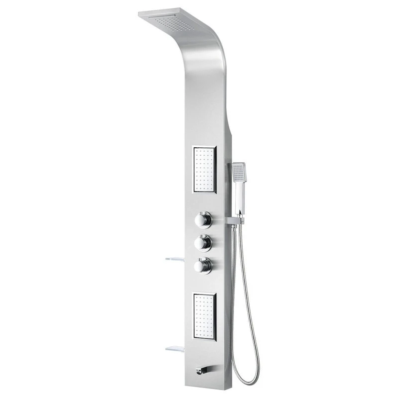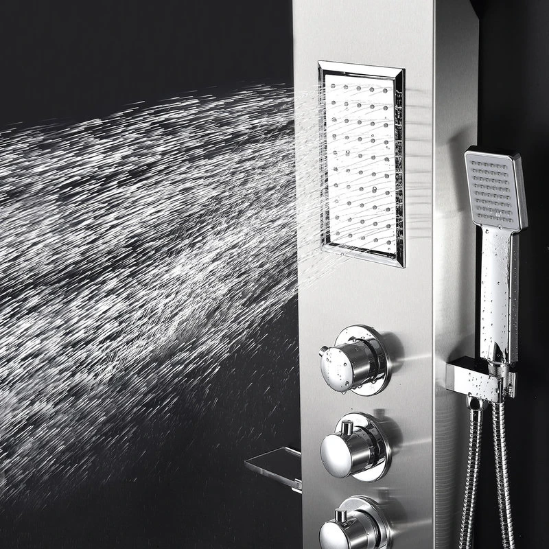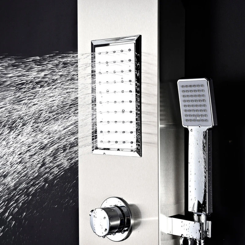 The ANZZI full body FIELD shower panel features a modern laser cut brushed 304 stainless steel body with 2 Acu-Stream body jets providing a relaxing yet powerful water stream to massage the body. The Heavy Rain shower head hangs overhead releasing a steady torrent of soothing water from above. And always positioned at the column’s flank is the Euro-Grip hand held sprayer with free reign reach of up to 60 inches. And everything is controlled through 3 chrome thermostatic and diverter controls.