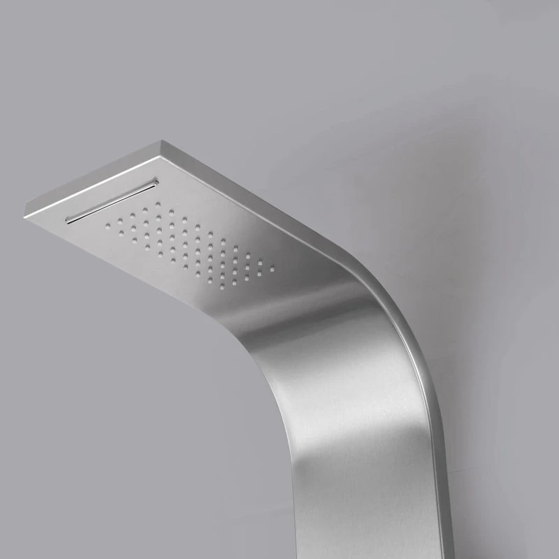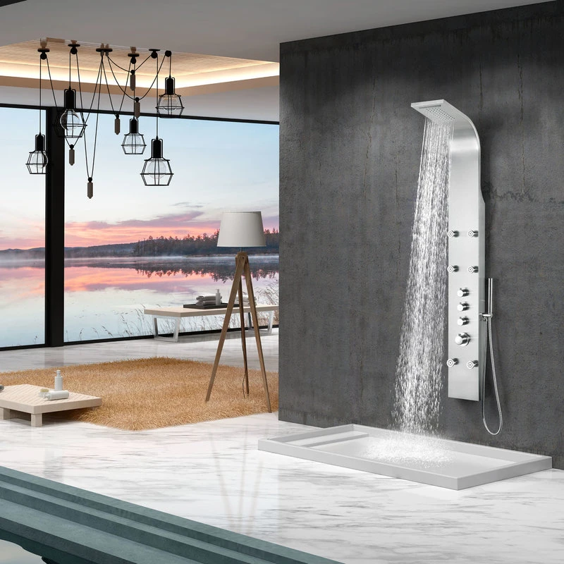 The ANZZI Full Body Fontan Shower Panel features a modern laser cut stainless steel brushed body with two Acu-Stream body jets provide a relaxing yet powerful water stream to massage the body. The Heavy Rain shower head hangs overhead releasing a steady torrent of soothing water from above. And finally, always positioned at the column’s flank is the brushed Euro-Grip hand held sprayer with free reign reach of up to 60 inches. And everything is controlled through four chrome thermostatic and diverter knobs.