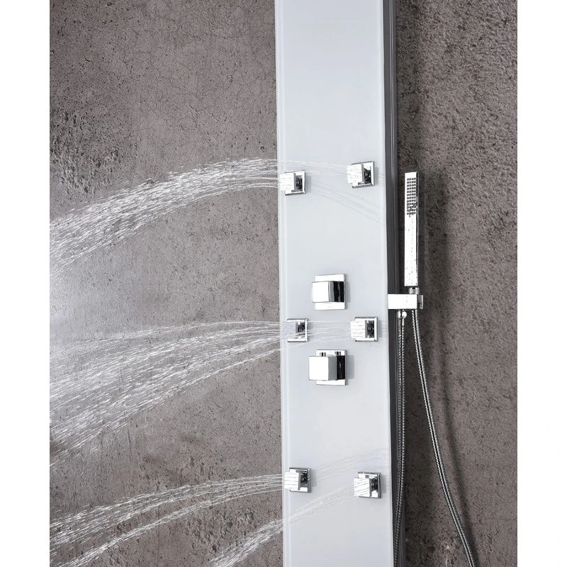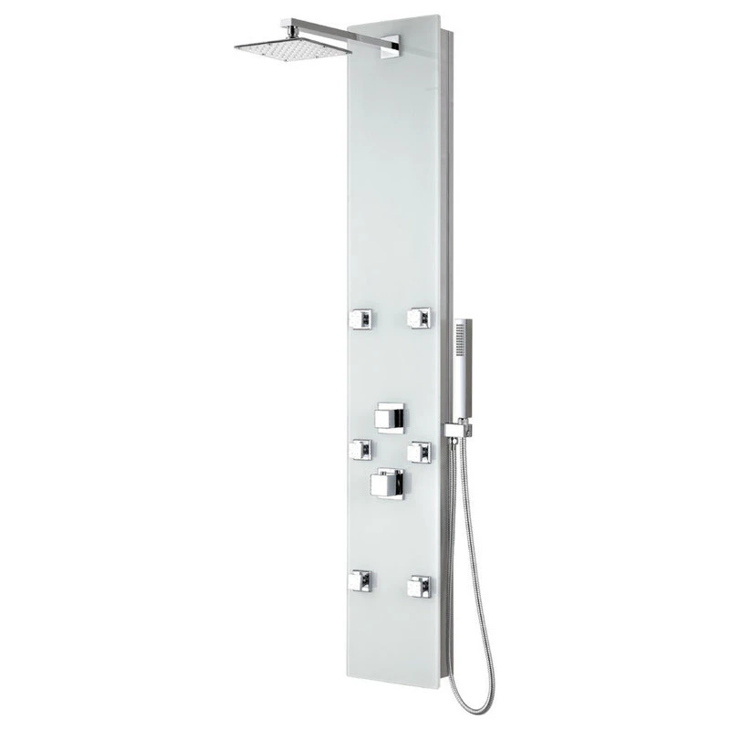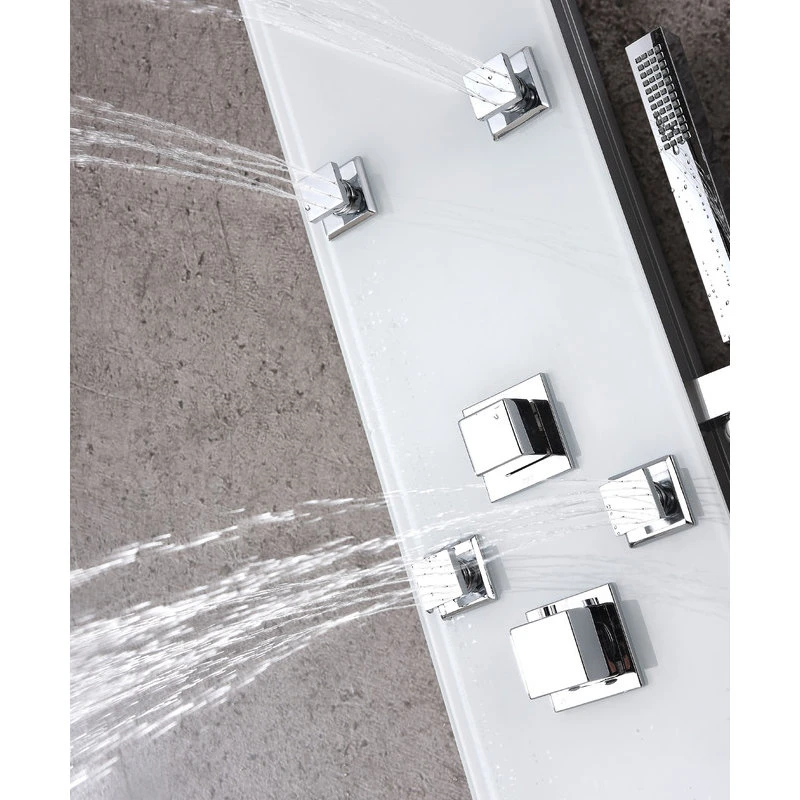 The ANZZI full body Rhaus shower panel features a modern laser cut Tempered Glass body with 6 Acu-Stream body jets provide a relaxing yet powerful water stream to massage the body. The Heavy Rain shower head hangs overhead releasing a steady torrent of soothing water from above. And finally, always positioned at the column’s flank is the Euro-Grip hand held sprayer with free reign reach of up to 60 inches. And everything is controlled through 2 chrome thermostatic and diverter controls.