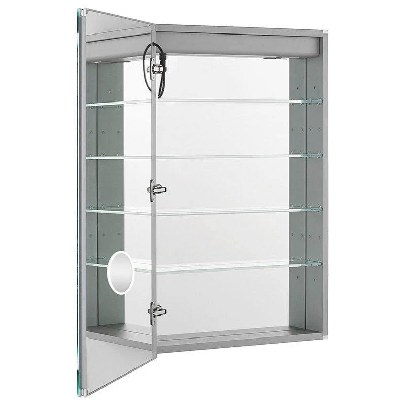 3X LED Magnifying Mirror: A 3X LED magnifying mirror is located on the inside of the cabinet. Integrated into the cabinet door this circular mirror sports a halo light around it.