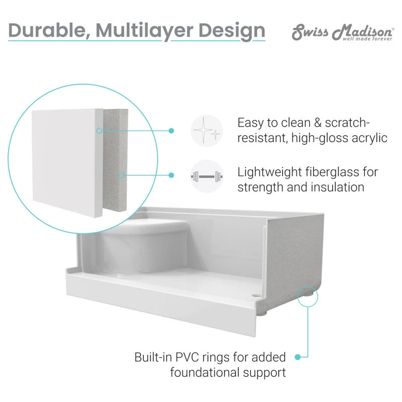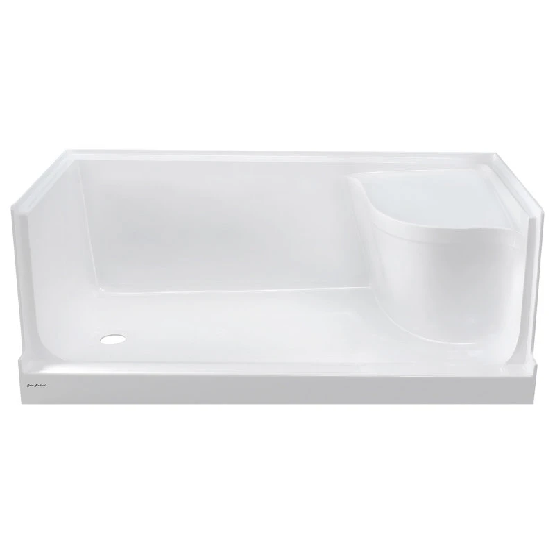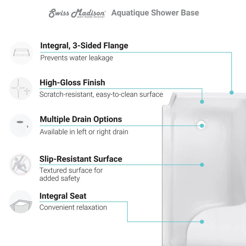 The Aquatique Threshold Shower Base is a powerful and stylish statement in any bathroom. Its practical design and low threshold provide easy access to the shower. The durable acrylic and fiberglass reinforcements make the shower base a robust selection. Equipped with a seat this shower provides comfort and secure footing for a luxurious experience.