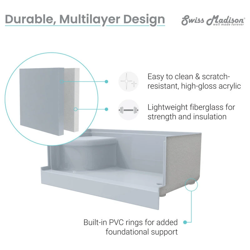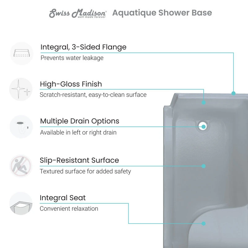 The Aquatique Threshold Shower Base is a powerful and stylish statement in any bathroom. Its practical design and low threshold provide easy access to the shower. The durable acrylic and fiberglass reinforcements make the shower base a robust selection. Equipped with a seat this shower provides comfort and secure footing for a luxurious experience.