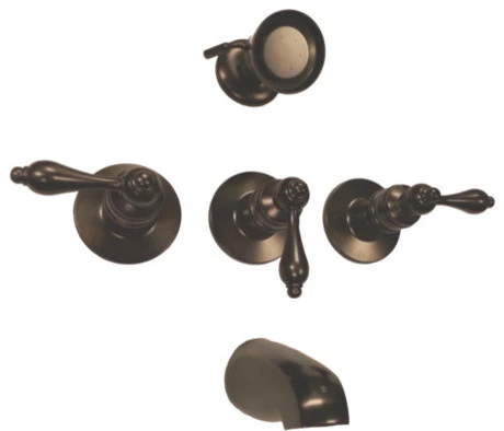 Three Lever Handle Tub & Shower Faucet in a Traditional Style. Matching Showerhead, Shower Arm and Spout. Matching Lever Handles, Dome Cap and Face Plate. Solid Brass Valve Body, Handle and Spout. Pressure Balance Diaphragm Valve.