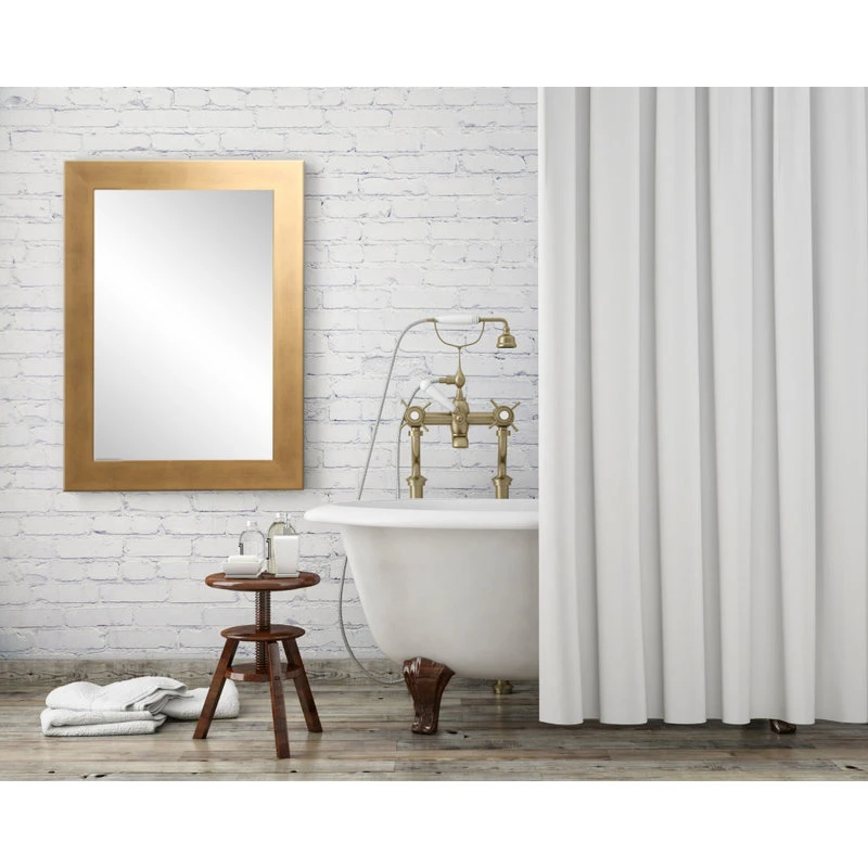 Brushed Gold Wall Mirror 32″ x 38″Created to enhance the functionality and style in your home, this sharp modern gold framed wall mirror is an impressive accessory to hang in your bedroom, bathroom or living space. This three inch frame features a cool brushed gold metal like finish. It comes with four hooks preinstalled allowing for vertical or horizontal hanging making this wall mirror easy to install.