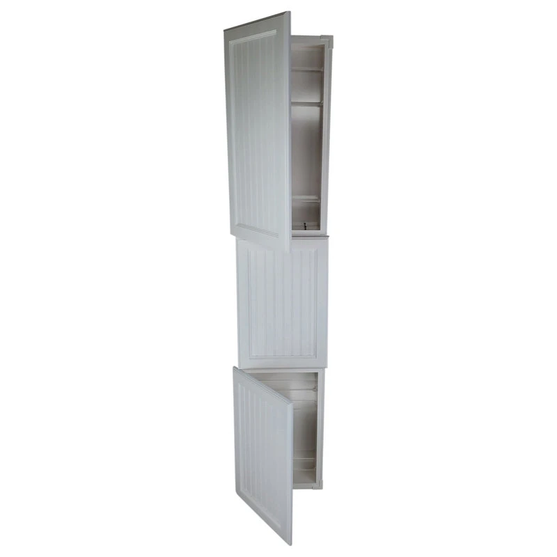 Perfect for any bathroom. Recesses in the wall between the studs, and simply screws to the studs on each side of the opening. Only the doors are outside the wall. Fully adjustable glass shelves inside. Our unique, patented design of shelf supports keeps each shelf in place. Concealed hinges with soft close built in assures the door will never slam shut, but softly close on its own instead. Box is SOLID pine and the Beadboard panel style door is SOLID maple. White enamel finish. The box is 3.5″ deep inside and gives you plenty of usable depth, but fits in standard 2×4 walls. This model has THREE doors which open to reveal two separate cabinet sections. Cabinet box is 12.5″ wide inside. Doors are reversible to open either Left or Right. Completely assembled! All you need to do is put one screw in each hinge to mount the door. Then insert it in the wall and screw it to the studs with included screws. If you are replacing a current cabinet, measure your wall opening! White plastic trim surround covers the rough edges of your opening up to 1/2″ all around. Doors cover the trim surround when closed so the only thing you see outside the wall is the door itself. Made in USA.
