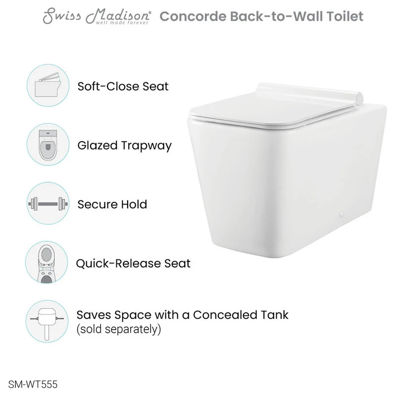 The Concorde Back to Wall Toilet Bowl possesses clean lines and fluid curves. Elegance is added to any bathroom given its graceful design, while the elongated bowl offers improved comfort. When paired with the Swiss Madison Concealed Tank Carrier, this helps increase available space, while still offering simple and easy access to the plumbing system. The eco-friendly dual flush will save significant amounts of water annually. When paired with our other fixtures from our Concorde collection a cohesive and highly personalized bathroom can be created.
