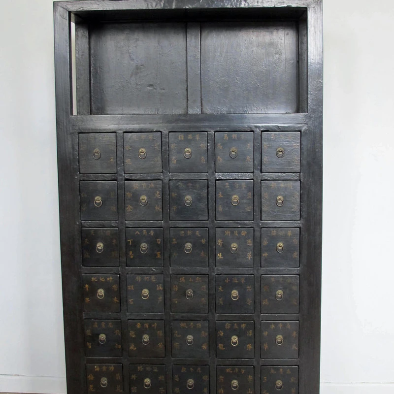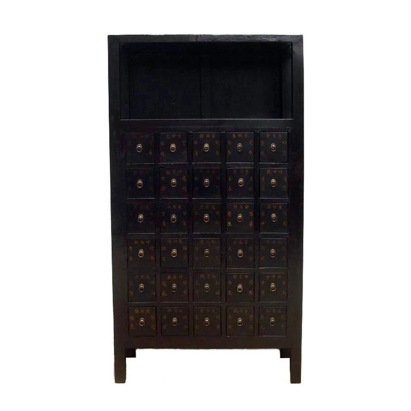 This cabinet with 30 drawers was used to hold herb medicines in a Chinese apothecary centuries ago. The name of each herb medicine is written on the door. It shows a nice patina in dark chocolate color. This exotic apothecary cabinet will not just be an excellent showpiece, but can be used as a CD cabinet or to store tools, office, or art supplies.