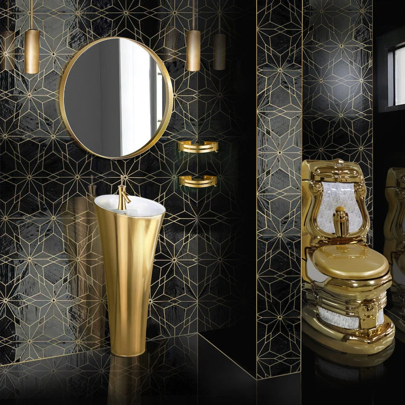 The body of the two-piece toilet is stunningly decorated with exquisite white and gold geometric shapes while ornate gold trim lines the toilet’s structure. A glossy gold seat, lid, and white porcelain interior complete the quality design of this bathroom staple.
