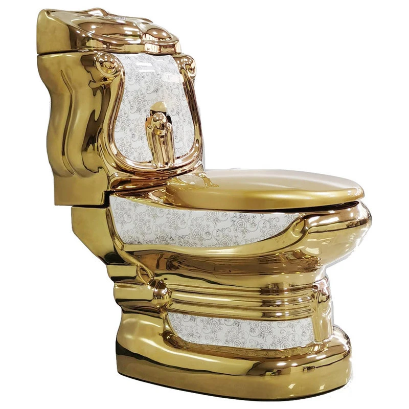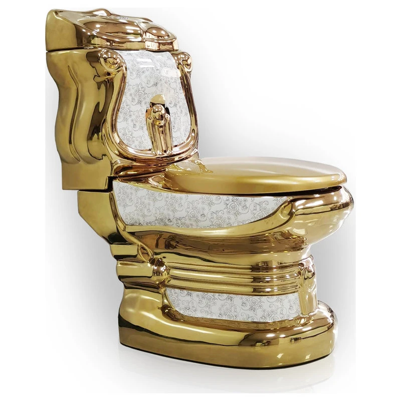 - A beautiful symmetrical design, this distinctive gold and white toilet serves as a unique, yet functional addition to your bathroom.