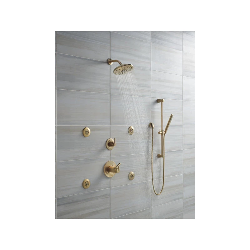 Delta H2Okinetic Showers look different because they are different. Using advanced technology, H2Okinetic showers sculpt water into a unique wave pattern, giving you 3X the coverage of a standard shower head.* The end result is a shower that provides more coverage, more warmth and more intensity for a truly drenching shower experience. With separate handles for volume and temperature control, this Delta tub/shower provides a more refined showering experience. Simply set the water at your preferred temperature and turn the shower on or off with the volume control handle – without interrupting your set temperature. Designed to look like new for life, Brilliance finishes are developed using a proprietary process that creates a durable, long-lasting finish that is guaranteed not to corrode, tarnish or discolor. The pause setting gives you ample space for shaving, lathering and other shower tasks, then easily restarts the water with the temperature where you left off. This spray setting helps you conserve water, so you can worry less about depleting your supply of hot water – and you help the environment too. Delta thermostatic valves use TempAssure Technology to protect you and your family from sudden temperature changes. Take the chill out of contemporary with the eloquent warmth of Champagne Bronze in your bath. This vibrant, gold finish provides a vivid splash of contrast to your space for a look that’s simultaneously modern and nimble, able to pair elegantly with traditional, transitional and contemporary decor. Delta WaterSense labeled faucets, showers and toilets use at least 20% less water than the industry standard saving you money without compromising performance.
