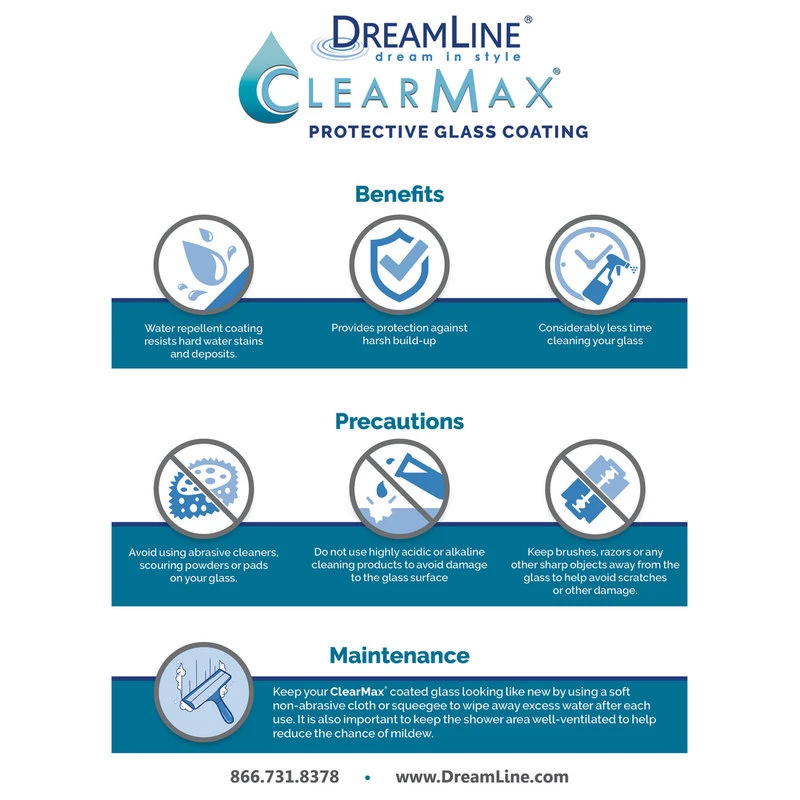 - DreamLine exclusive ClearMax water and stain resistant glass coating