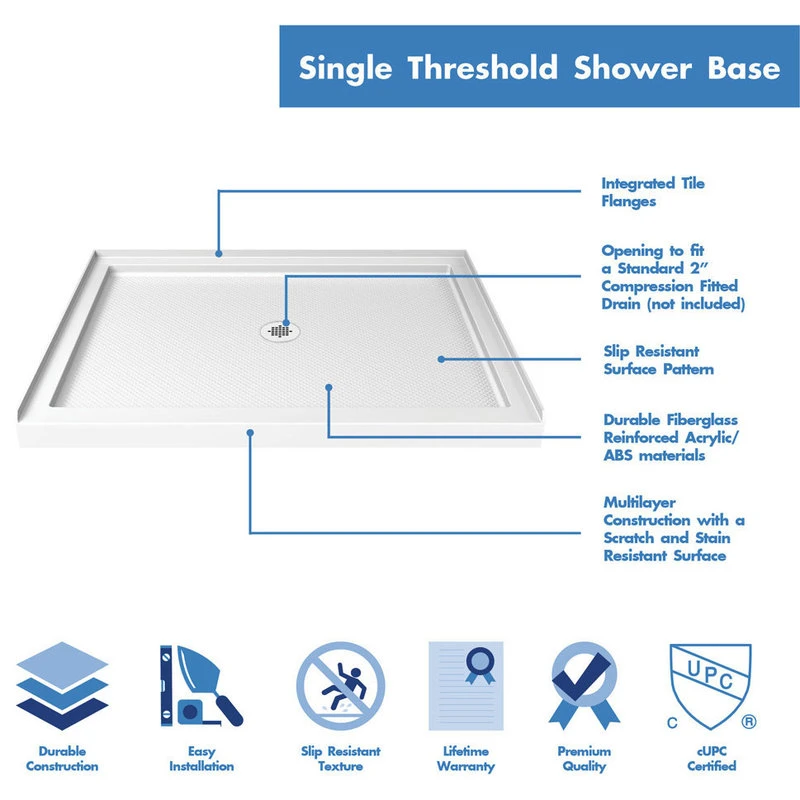 The DreamLine SlimLine shower bases showcase premium high-gloss acrylic, reinforced with fiberglass for durability and a modern, low profile design. SlipGrip textured floor surface offers slip resistance for safety. Glossy acrylic finish safeguards against stains for easy maintenance. DreamLine SlimLine shower bases are available in multiple colors and are sure to complement your bathroom style!