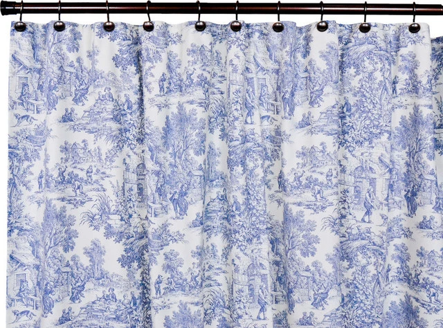 Ellis Curtain Victoria Park Toile Bathroom Shower Curtain–Toile print fabric originated in France in the 18th century and immediately became a popular decorating pattern that still holds true today. The classic country scenes and soft cotton fabric will change and improve the look and feel of any room while adding a touch of style. Made with 100 percent cotton creates a smooth draping effect and softer texture that some times can’t be achieved with inferior synthetic fabrics. You are sure to get a curtain that. s beautiful and functional in a decorating pattern that’s timeless and long lasting. The shower curtain measures 70” wide and is 72” long from top to bottom of panel. One shower curtain will fit a standard size shower and will require 12 shower curtain rings to hang.