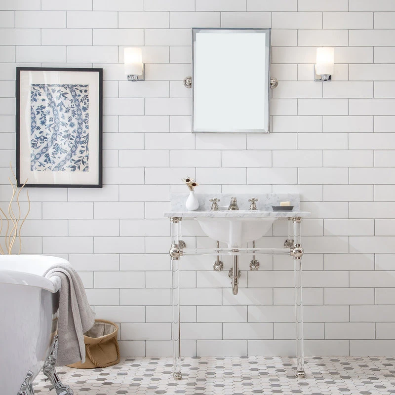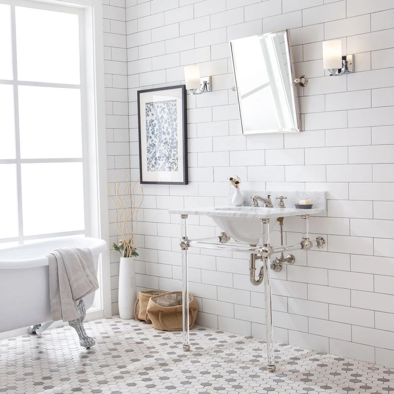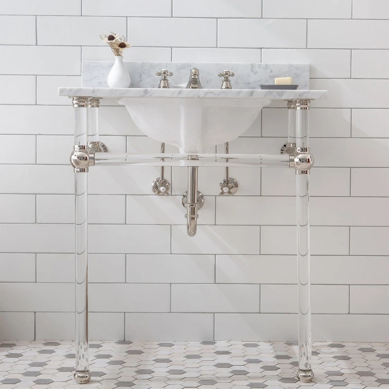 The Empire collection wash stand enhances contemporary beautification into a sophisticated bathroom. It was inspired to perfect the elegant designs on your bathroom. Copper joints and acrylic stand melding for a cohesive whole, this carrara white marble wash stand sink with crystal clear acrylic stand is a perfect match your bathroom. An accessible bar across the front of deluxe, substantial acrylic legs not only improves stability but also is perfect to rest towels and toiletries. The timelessness of the artful design reigns the royalty vibe of your bathroom.