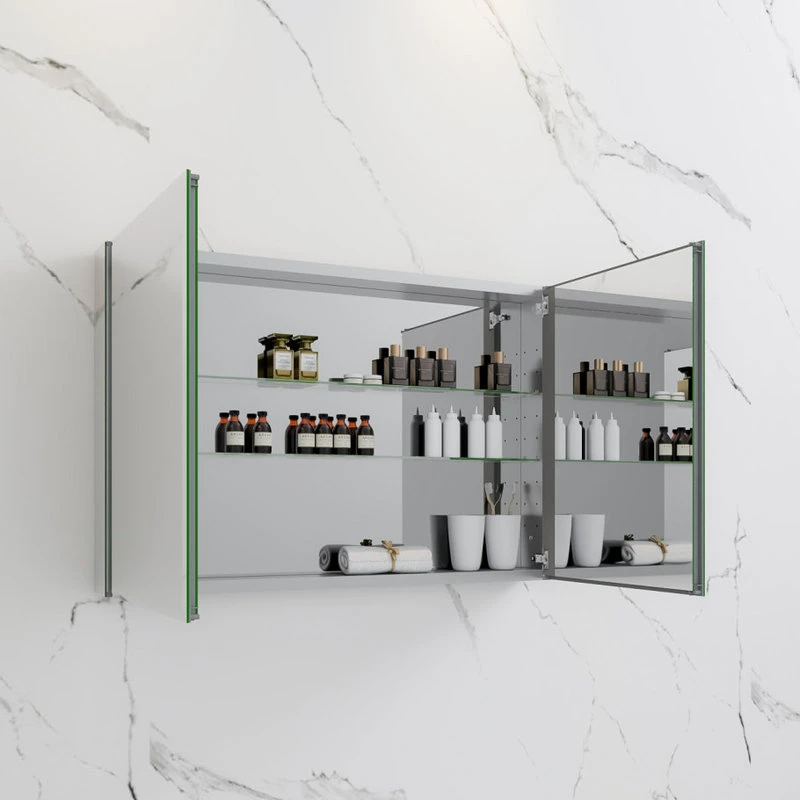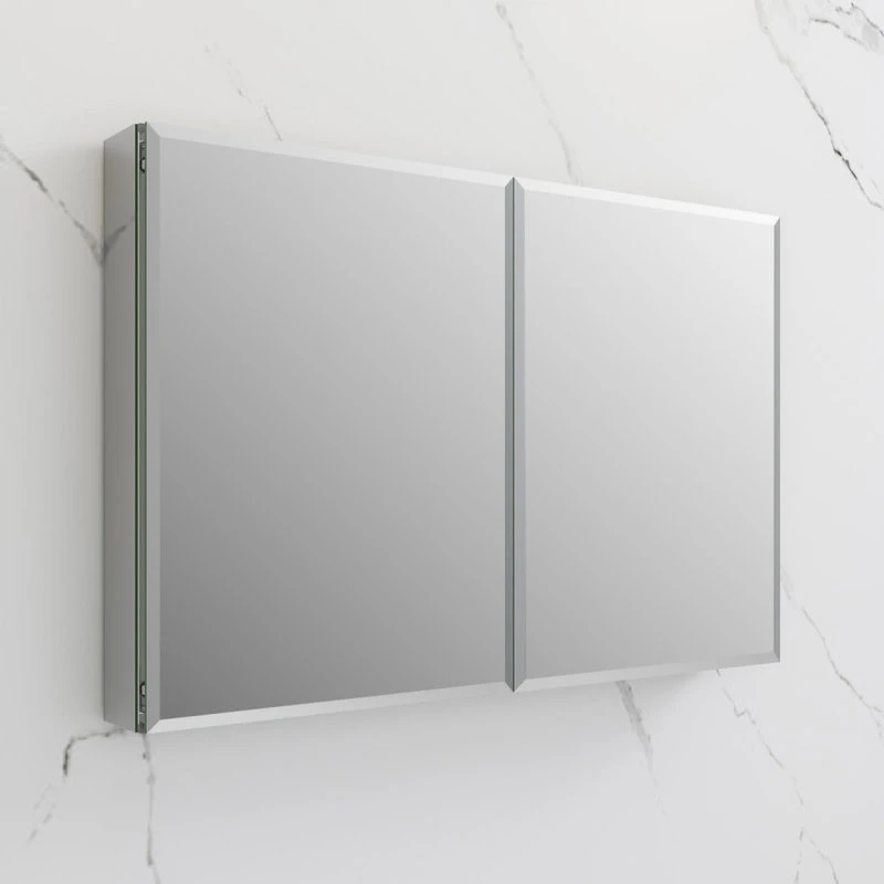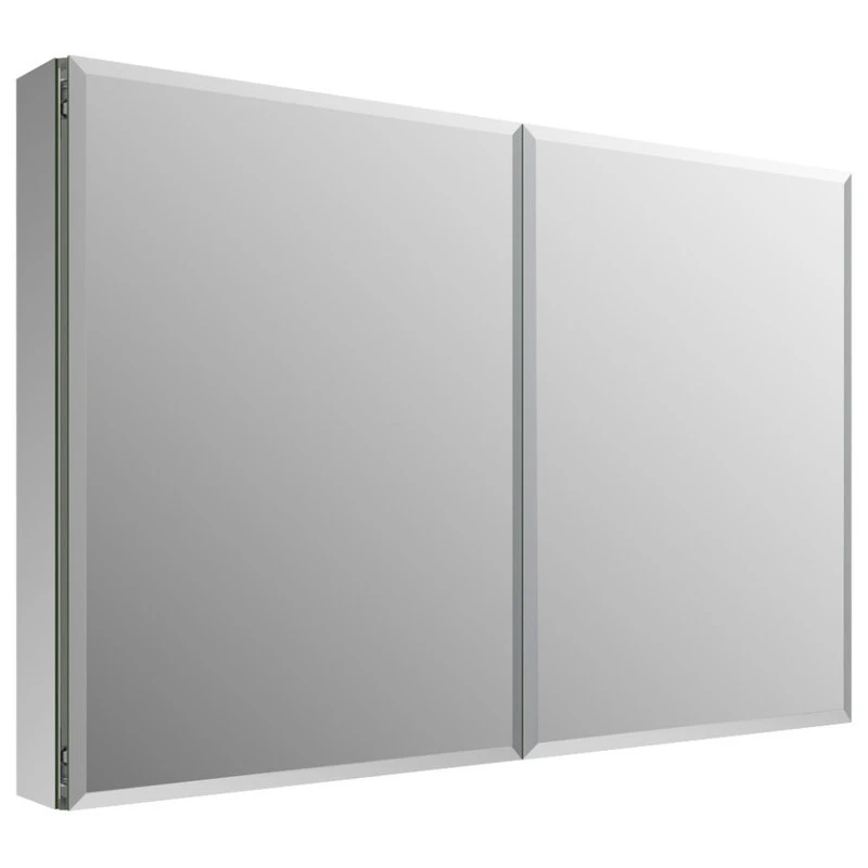 This stylish rectangular bathroom medicine cabinet has a contemporary frameless design with a beveled edge. The 2 mirrored doors open to reveal a second mirror at the back of the cabinet and two adjustable glass shelves that can accommodate items of varying heights. An anodized aluminum frame creates a moisture and dust resistant interior.