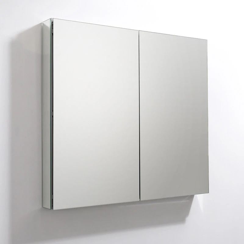 This stylish rectangular bathroom medicine cabinet has a contemporary frameless design. The 2 mirrored doors open to reveal a second mirror at the back of the cabinet and four adjustable glass shelves that can accommodate items of varying heights. An anodized aluminum frame creates a moisture and dust resistant interior.