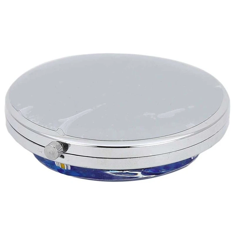 The folding mirror features authentic Murano Glass top and shiny durable silver-plated finish. It opens up to reveal two high-quality round mirrors. The mirror is easy to open with a click of a button and it closes easily and securely. There is no glass on the bottom.