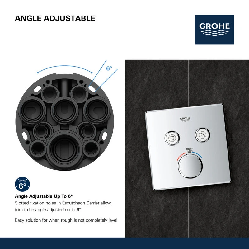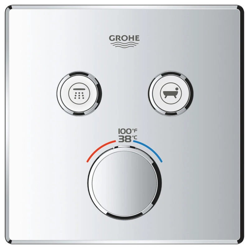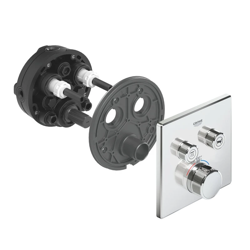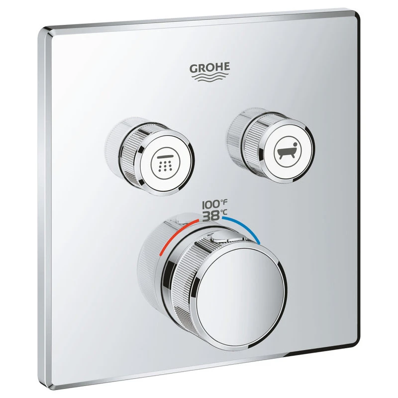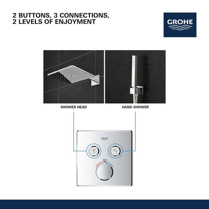 Choose a thermostat that is as flexible as possible for your most enjoyable shower or bath ever. Packed with useful features, the Grohtherm SmartControl concealed thermostat features a minimalist design that will enhance any modern bathroom. The innovative SmartControl technology allows you to select your desired spray source and adjust the water volume at the push-turn of a button. The three valves offer total flexibility, whatever your shower set up you can control, switch between or even combine different spray patterns and water outlets perfect for spaces where you want to have hand, head and side showers, as well as a bath. Integrated GROHE TurboStat technology prevents any unpleasant temperature fluctuations. GROHE EasyLogic markings and textured buttons with exchangeable symbols make it easy and intuitive to use. Family-friendly, the GROHE SafeStop override button allows you to set a maximum temperature of 100F/38C to prevent scalding. Water-saving GROHE EcoJoy technology gives you the option of a reduced flow rate with no compromise on enjoyment. Thanks to the GROHE QuickFix system it’s swift and straightforward to install. The slim profile makes it easy to keep clean, and the durable StarLight Chrome finish will look pristine for years to come. With a slim, round design perfect for that minimalist, streamlined look, this product is bound to enhance your bathroom scheme. Please note that this product must be installed in combination with the GROHE Rapido SmartBox (35601000).