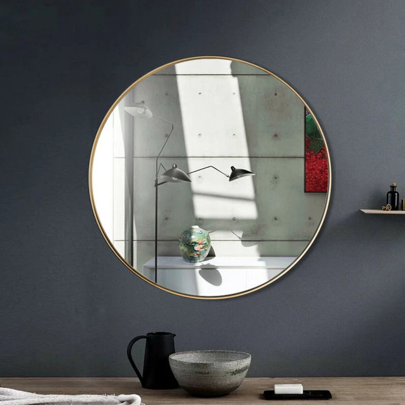 This is our round bathroom mirror which combines reliable quality with modern appearance. The frame of this modern mirror is made of premium power coated metal and durable MDF borad which can acclimatize to humidity. Large size mirror with high resolution is convenient for you to make up and dressing. The circular design will not make our mirrors look out of place which is suitable for different finishes. This wall mirror can be placed in the bathroom, living room, hallway and even used as your makeup mirror. Durable keyholes on the back can be matched with screws, ensuring th mirror can hang firmly on the wall. It is a great way to place two mirrors on adjacent walls for opening up space.