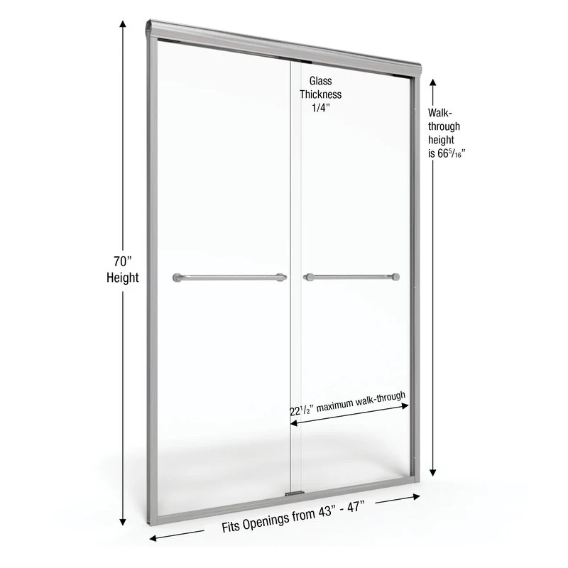 A Basco Infinity glass shower enclosure proves that less is more with its frameless bypass glass panels. The quarter-inch thick glass features polished edges and showcases two through the glass towel bars. Moderate DIY Skills are recommended for installation of the shower enclosure. To reduce water we recommend placing the interior panel to be positioned closed to the shower head. Ensure your measurements are precise and finished wall material is in place before measuring for your shower door.