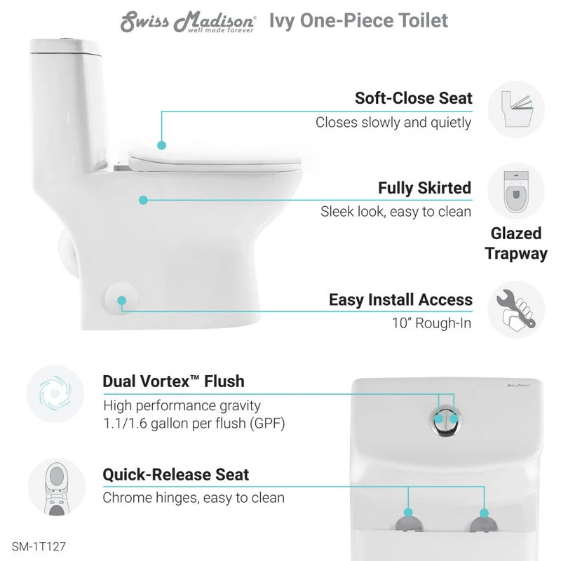 The Ivy One-Piece Dual-Flush Elongated Toilet is a stylish modern addition to any bathroom. The Ivy’s sophisticated and elegant design includes a 10” Rough-In, allowing for convenient space-saving and flexibility. Its dual-flush function conserves water without compromising on power, while our Vortex™ flush technology uses powerful dual nozzles to keep your bowl cleaner than standard rim holes. Built with a chrome-plated top flush actuator, this elongated bowl toilet will enhance any bathroom setting.