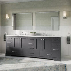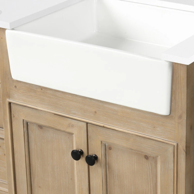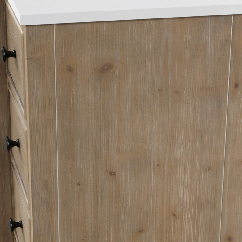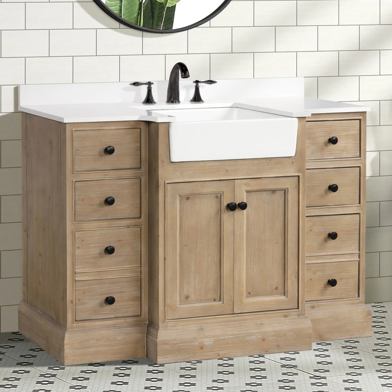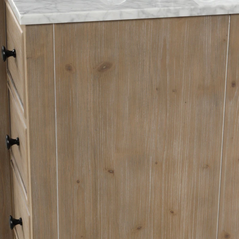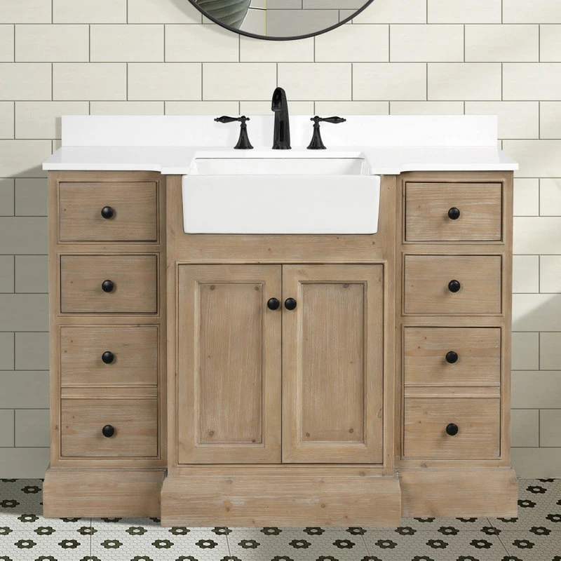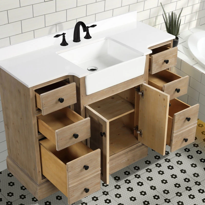 The 48″ Kelly single sink bathroom vanity will be the centerpiece of your bathroom remodel. Skillfully constructed of solid wood to last a lifetime. Wood is skillfully finished with raised grain to give a distress and reclaim wood look. Six solid wood dovetail drawers with full extension glides give you all the necessary storage room for your daily toiletries.