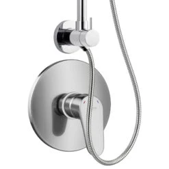The three-handle tub and shower faucet offers contemporary elegance made with sleek lines and sharp curves providing a state-of-the-art theme with existing bathroom furnishings. With a thick 2-1/4″ shower head hanging at 7-1/8″, the water experience is sure to be satisfying along with the three control levers, each to enable volume and temperature control. 1/4-turn washerless cartridge Beautiful premier finish Fine artistic craftsmanship