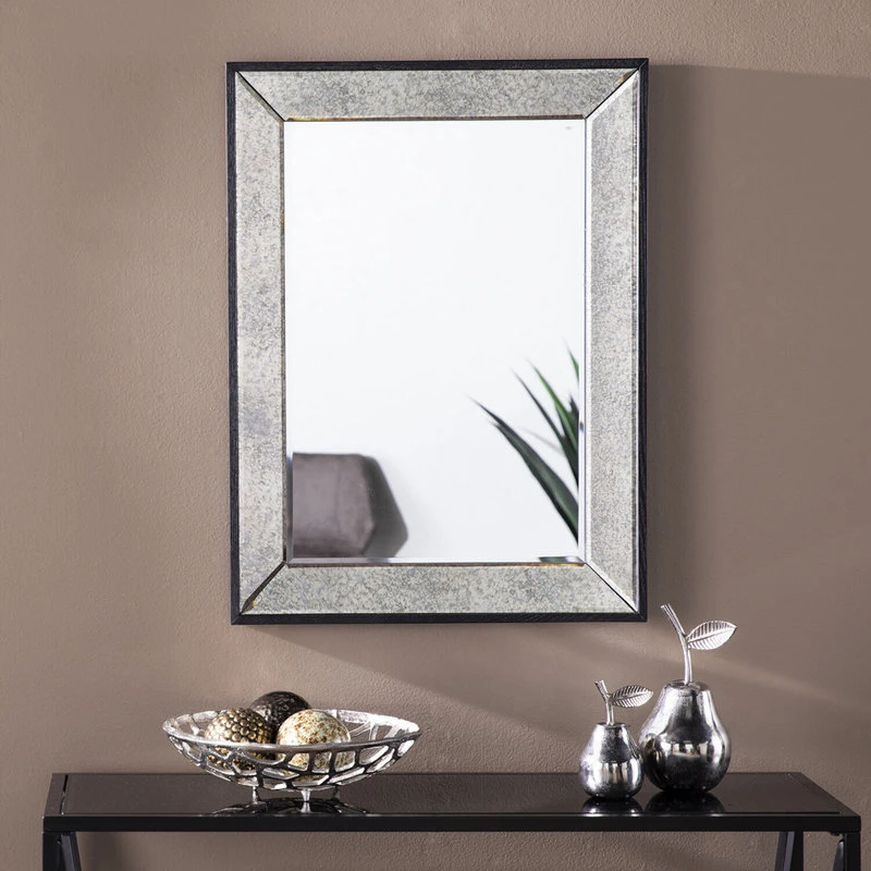 Reflect glam style from all angles with this decorative wall mirror. Antique mirror borders add a rustic feel to your living space, while black frame accents ground the fashion-forward design. Both functional and chic, this rectangular mirror works over an entryway console or in your small space powder room. Modernize your wallspace when you bring home this hanging wall mirror.