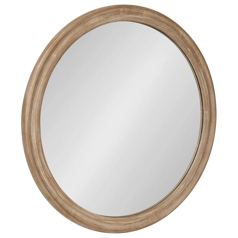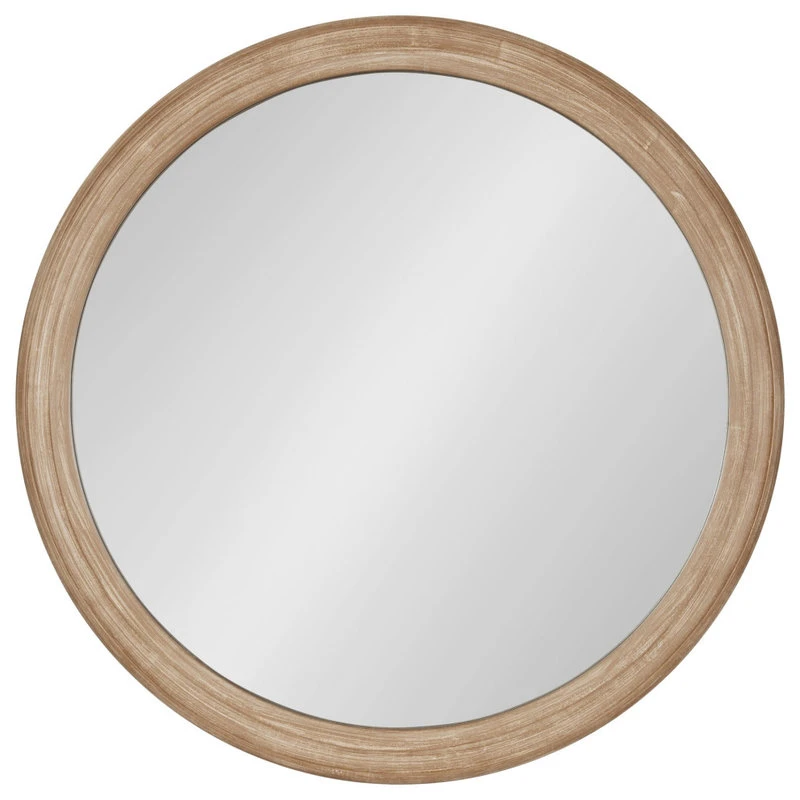 Make a bold and sophisticated statement on your wall with the beautiful transitional style of the Mansell decorative wall mirror. A well-built, ornamental wooden frame borders the round circular-shaped glass mirror. Its sophisticated, rustic brown-finished frame features a sloped style and has a durable, textured wood construction. Hang this lovely statement piece proudly over your vanity, dresser, shelf, or hang it as an accent piece in the living room, dining room, family room, or bedroom. The shape will be a great way to break up the straight lines of a gallery display or just the right size for smaller wall space. No matter the setting, the Mansell is sure to add a charming visual appeal to any room. The outside diameter of this round mirror is 28 inches. The actual mirror is 24 inches in diameter. Hang your new Mansell wall mirror quickly with the metal D-ring hangers securely attached to the back of the wooden frame.