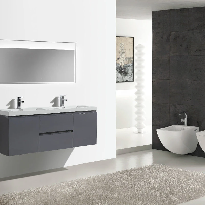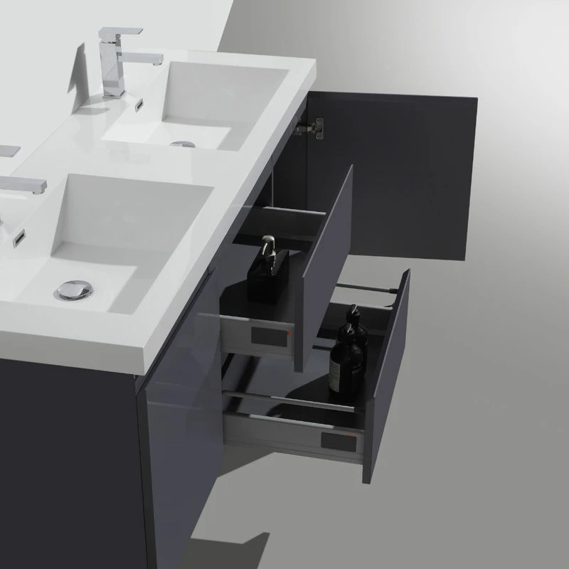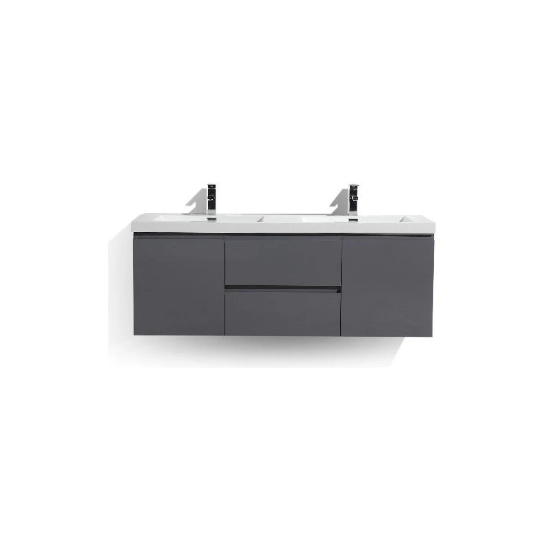 The high gloss gray MOB Wall-Mounted Vanity With Reinforced Acrylic Sink measures 60 inches in width and offers plenty of space and storage. This piece features soft-close, handleless doors and drawers for a sleek, sophisticated look. Its waterproof body is topped a reinforced acrylic countertop and a sink with a rectangular, chrome overflow. This piece is a bold, contemporary statement for your bathroom.