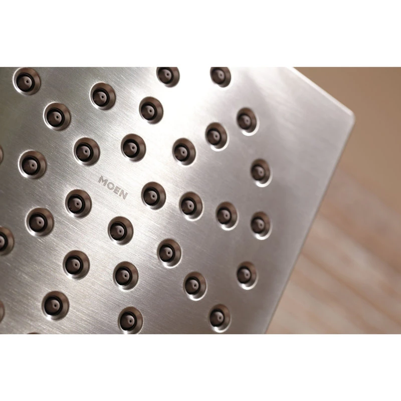 - Advanced, self-pressurizing Moen immersion rainshower technology channels water through the showerhead with three times more spray power than most rainshowers for a more thorough rinse