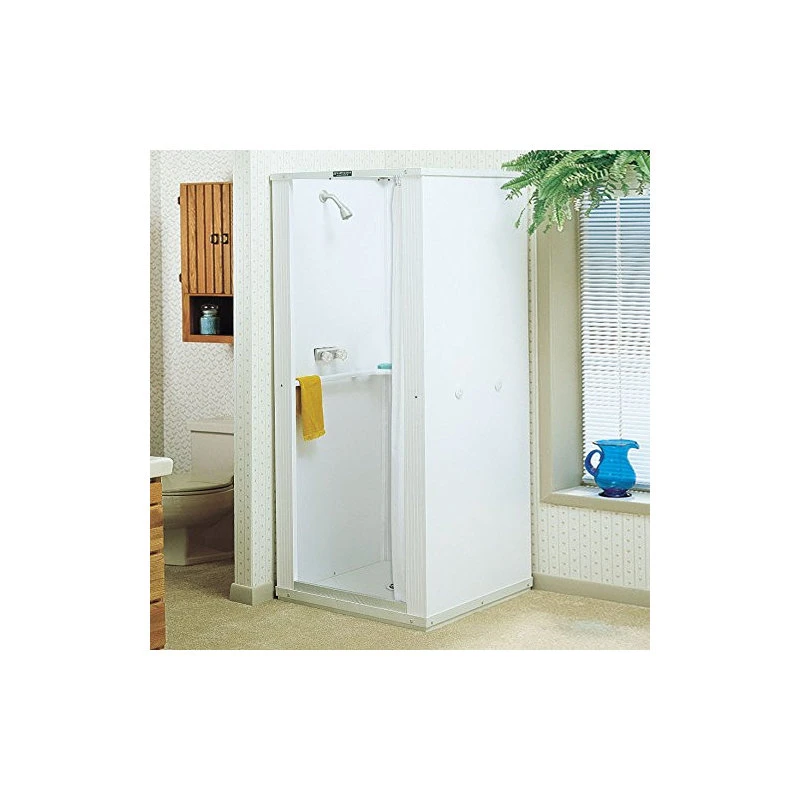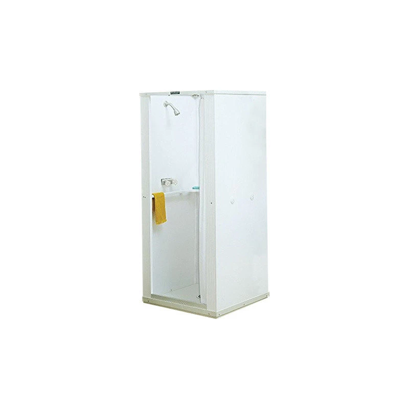 Includes shower walls, shower base, shower valve and head, shower curtain and rod, safety railing, assembly hardware. 30-in x 30-in slip-resistant floor with drain,Brass shower valve and head. Safety railing with molded-in soap dish and shampoo holder. Mold and mildew-resistant components. Knock-down construction makes portability extremely easy and is free-standing when assembled.