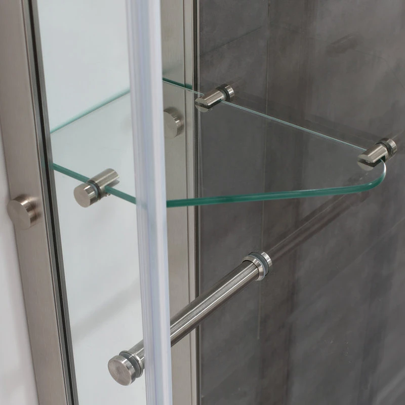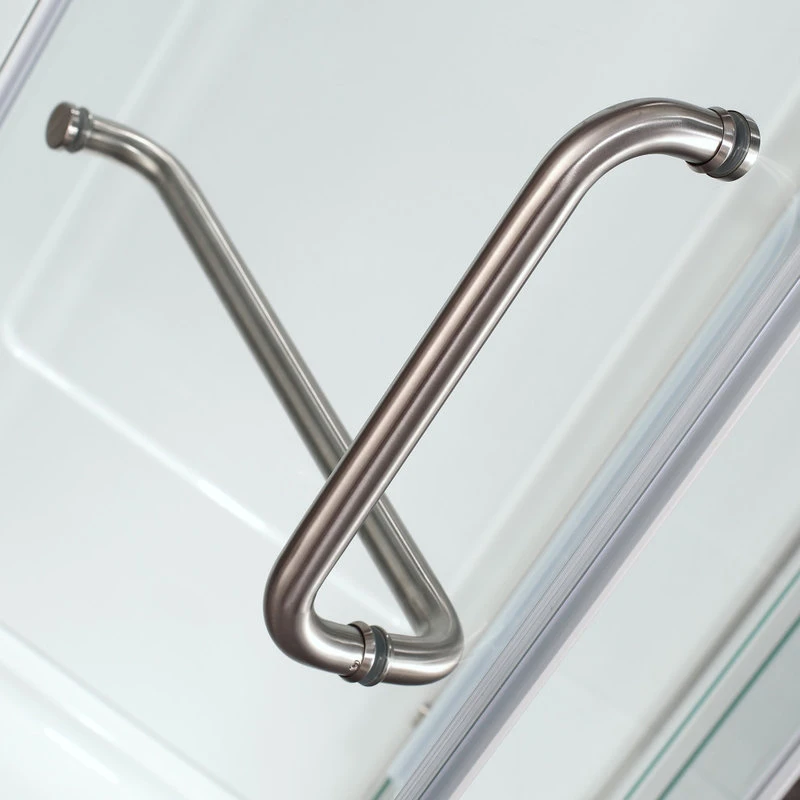 - Satin nickel cross handles on door, and oversized handles in fixed side panel