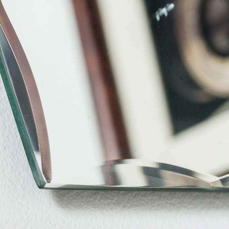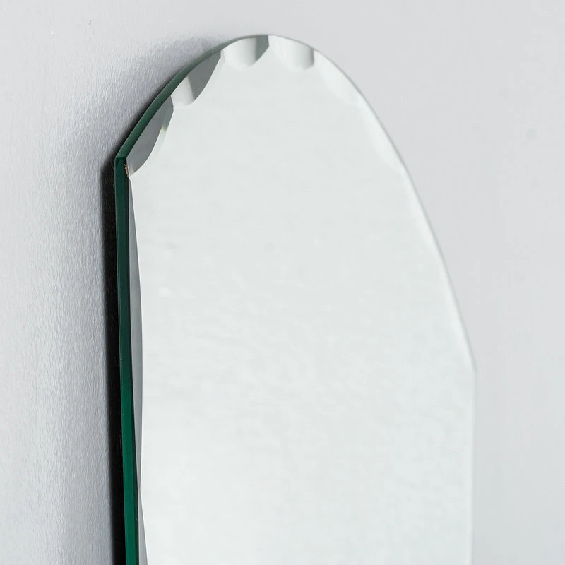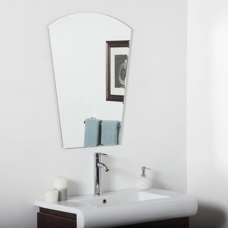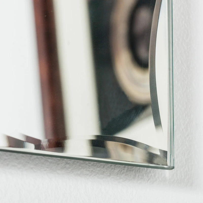 This large frameless bathroom mirror features a unique scallop bevel border. Add this mirror to any room in your home to reflect, illuminate and impress your guests. The invisible mounting hardware is designed to keep the top and bottom of the mirror flush against the wall.