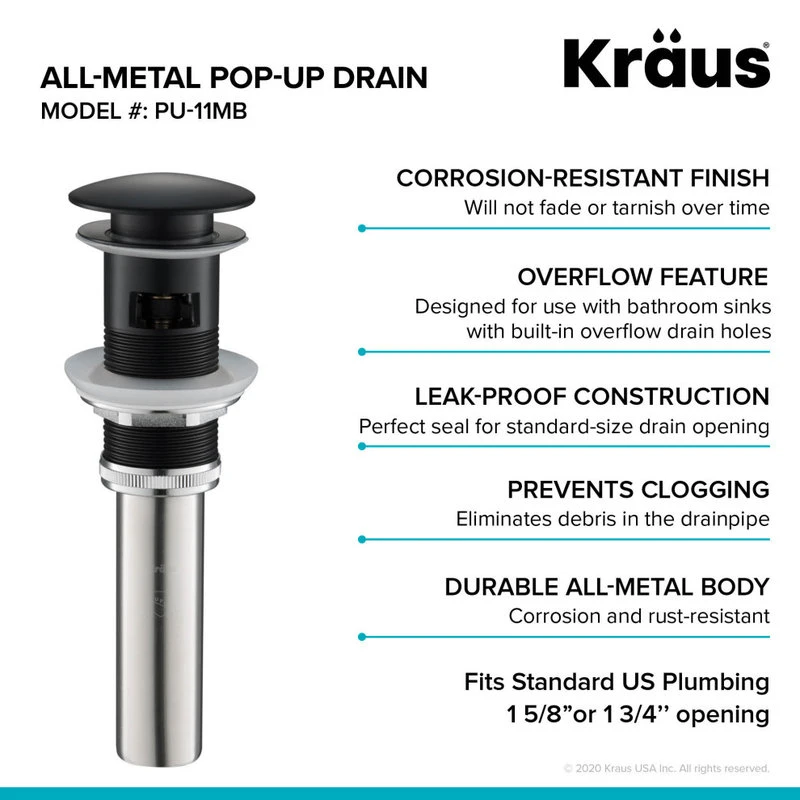 With clean lines and sturdy construction, Kraus bathroom accessories provide everyday efficiency with style. Constructed from brass, the pop-up drain is designed to work with any above-counter vessel sink with overflow. For easy installation, all required rubber gaskets are included. Choose from four distinctive finishes to match your bathroom faucet and create a beautifully coordinated look.
