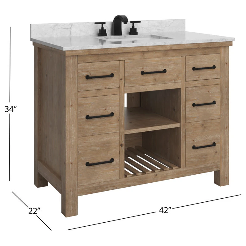 Revitalize your bathroom with the Rawley 42″ single sink vanity. This hand-crafted, eye-catching centerpiece is built to last a lifetime, with its authentic Italian Carrara marble countertop effortlessly supported by a sturdy and warm solid fir wood base. Each drawer is ready to house any bathroom essentials that need a home thanks to its expertly crafted,long lasting dovetail joints. There’s no denying that this rustic, freestanding vanity is built to be the star of any farmhouse remodel.