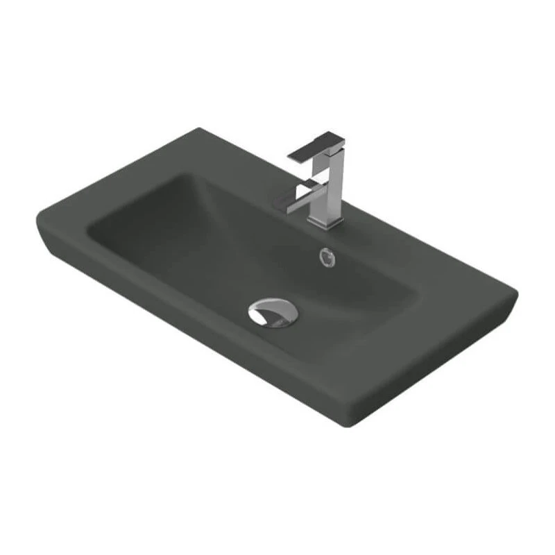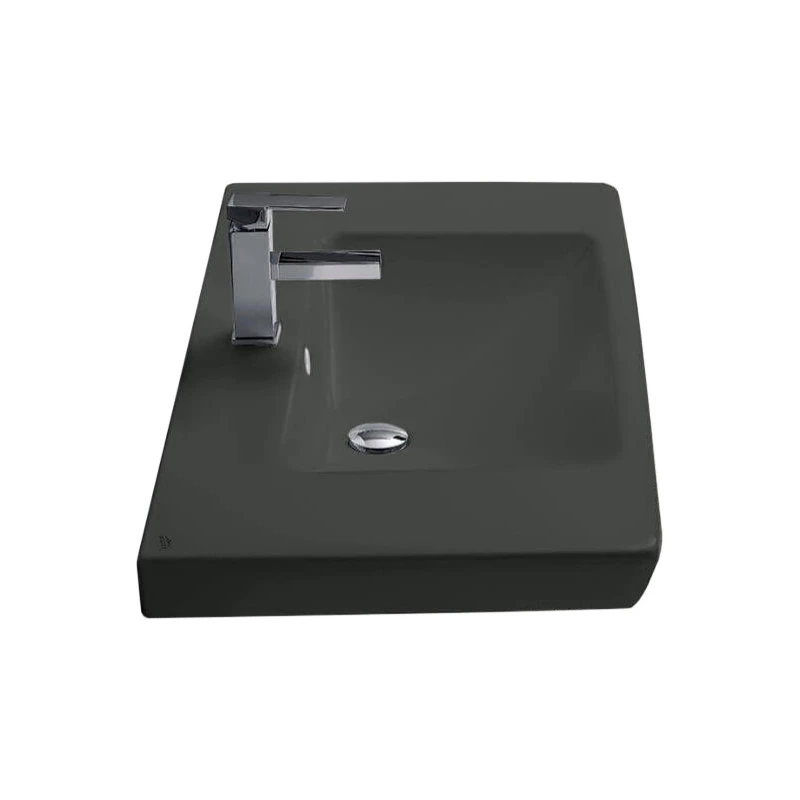 26 inch wall mounted or drop-in bathroom sink with one faucet hole and an overflow. Sink is made of high-quality matte black ceramic. This modern sink is made and designed by well known Turkish brand CeraStyle.