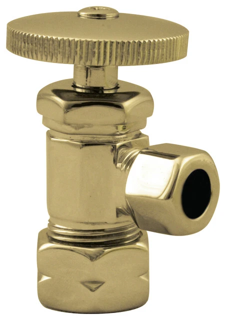 This Angle Stop with Round Handle is the perfect compliment for sinks and toilets. It uses a 5/8 in. Compression Inlet (For 1/2 in. Copper pipe) with a 3/8 in. OD Compression outlet with nut and ferrule. The valve uses a compression style closure for a positive seal. It is available in a variety of finishes.