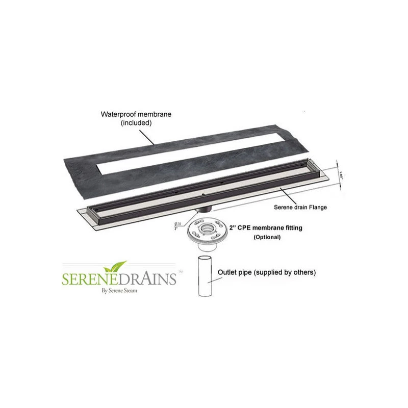 Complete Set: Channel Body, Stainless Steel Grate, Drain Puller, Waterproofing Membrane Sheet to place around the drain flange (not required but included).