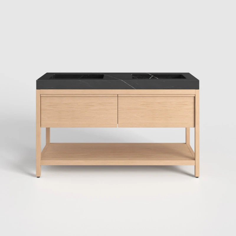 Sleek and understated, this 60-inch white-wash oak vanity will stand the test of time. The Bulgaria Gray Quartz top features recessed double-sinks and a delicate veining pattern laced within the light wood – bringing movement to the eye. The handle-free drawers, smooth countertops and open shelving style are perennial and functional, living up to the ideals of the MOD brand.
