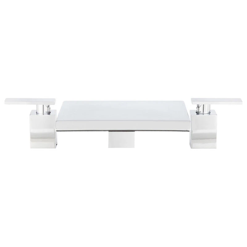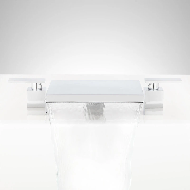 Imagine your tub accented by the Lavelle Roman Tub Faucet, which boasts a sleek waterfall spout. Two modern handles set on square columns control temperature on this solid brass faucet set.Signature Hardware 924636 Features: