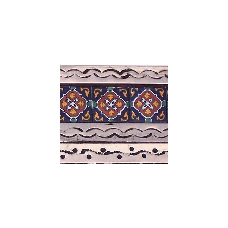 This tin mirror is fully decorated all the way around its frame with waved and dotted lines. These decorations are known as punched tin. In the central part of the frame has hand-painted Talavera style dolores, blue background tile.This mirror will delight your home d?cor. It will fit any dressing area such as your bathroom or a hallway. On each corner it has a square with an 8-petals flower in the center. All of it in a single piece of tin. A piece of art that you will be delighted with, and proud to hang it on your walls.
