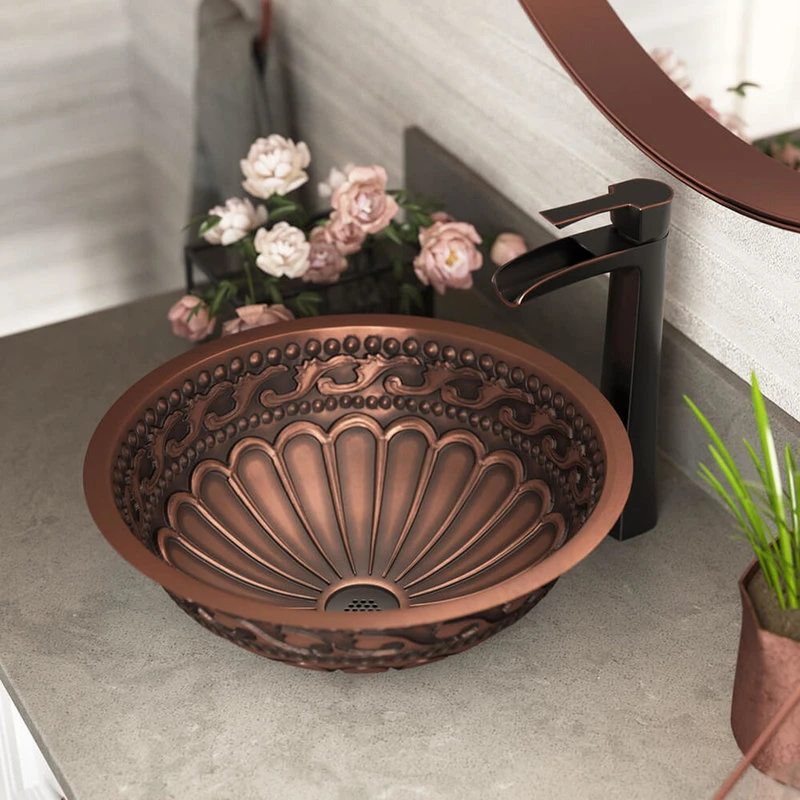 An impressed scallop pattern of ornamental shapes and dots repeats around the interior and exterior of this copper vessel with its ever-changing patina. A special feature of this design is that it can be mounted under, over, or on the counter as a vessel sink. With an overall measurement of 16 3/8″ x 16 3/8″ x 6″, it will require a minimum-width cabinet of 18″. The 731-ABR , single-handle, vessel faucet reaches a height of 12 1/4″ and features a classic trough-style spout with a 4″ reach. Its sleek lines gradually widen and contract to create a stunning design statement. The single handle has a flat top with an inverse curve below to mimic the spout design; and it easily sets just the right water flow and temperature. Ceramic disc cartridges assure long-term, dependable operation, and a beautiful antique bronze finish completes its distinctive appearance. The faucet is constructed without lead and is compliant with NSF (National Sanitation Foundation) standards, the Safe Drinking Water Act, the cUPC (Uniform Plumbing Code of the United States and Canada), the ADA (American Disabilities Act) and carries the EPAs WaterSense label. Additionally, a grid drain (gd) is included, which allows water to pass through while catching solid debris with its attractive antique bronze cap.