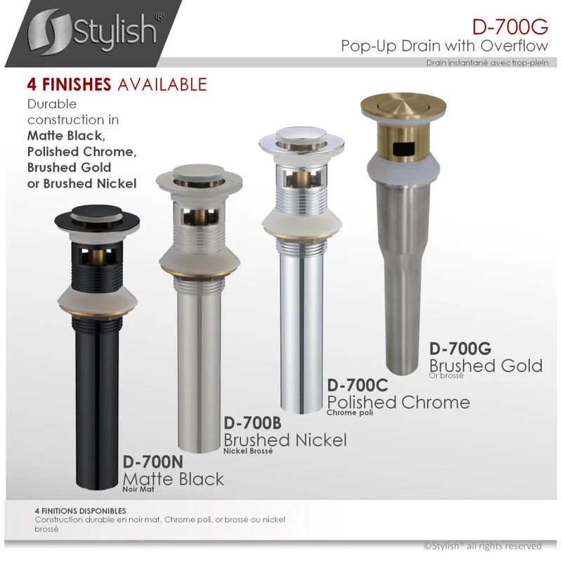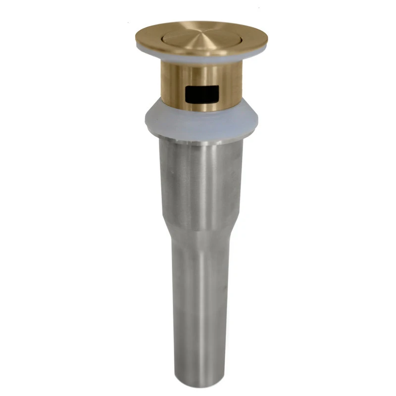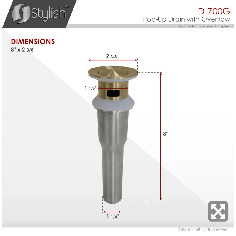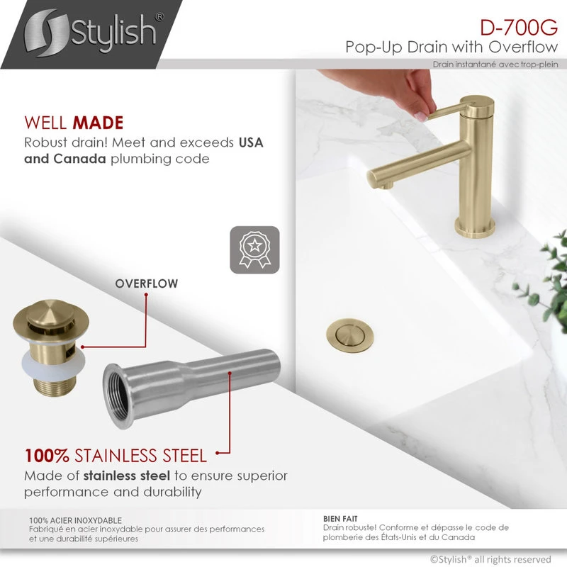 Complete the look of your bathroom with the clean lines and sturdy construction of this advanced pop-up drain with overflow. D-700G pop-up drain made from 100% stainless steel is designed to work with any ceramic, or porcelain undermount basin sink. This pop-up drain readily connects to 1-1/2-inch plumbing hookups. Stylish pop-up drain opens and closes by pressing the top of the cap, which allows for both draining and retaining water. For easy installation, all required rubber gaskets and hardware are included, rubber seal rings fit up to 1-3/4-inch sink drain hole.