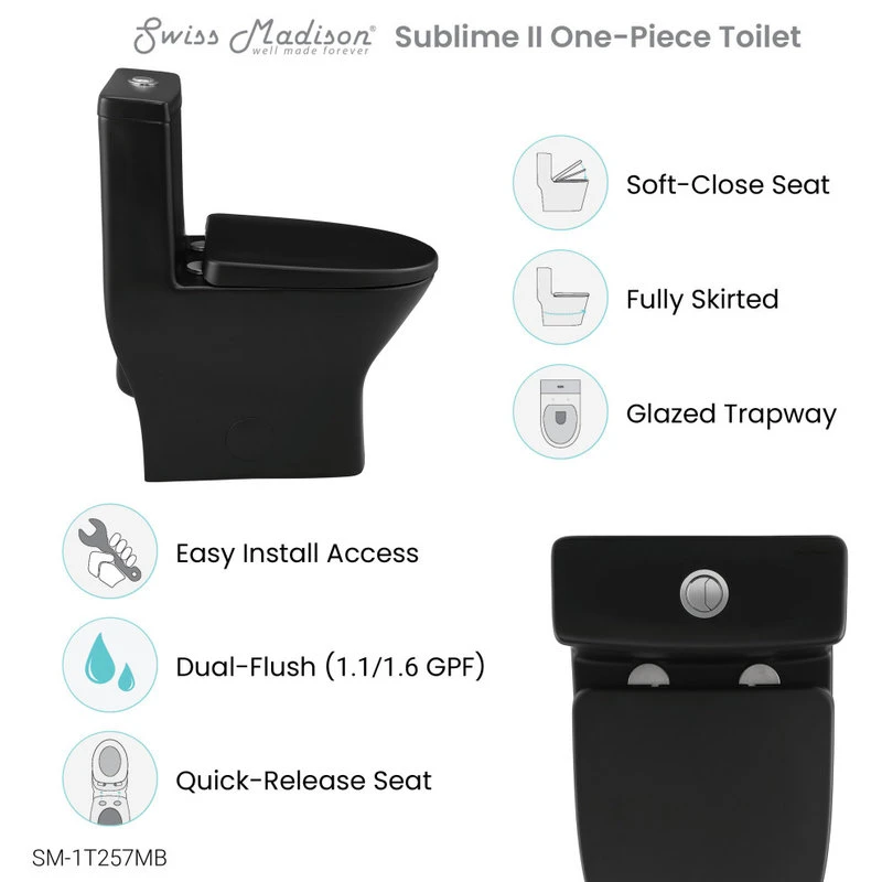The Sublime II tank drops seamlessly into a fully skirted smaller bowl creating a slender one piece toilet. Dual flush allows you to choose between partial and full (.8/1.28) flush, without sacrificing excellent performance.